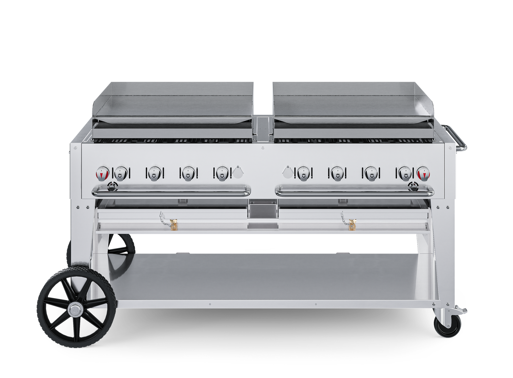 This Mobile Griddle is designed to cook high volumes of product in a short period of time and is built to convert with ease into a Charbroiler for dual function use.Griddles are constructed of 5/16” cold rolled steel with stainless steel splash guards and a removable stainless steel grease tray.